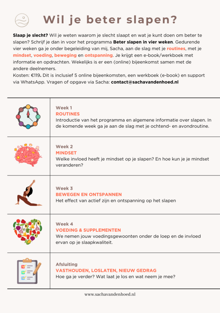 Kortom: slapen is een samenspel van allerlei schakels. Ik ga hier dieper op in in mijn gratis e-book, waarin ik de basisregels beschrijf voor het hebben van een goede nachtrust. Deze is binnenkort hier te downloaden.
